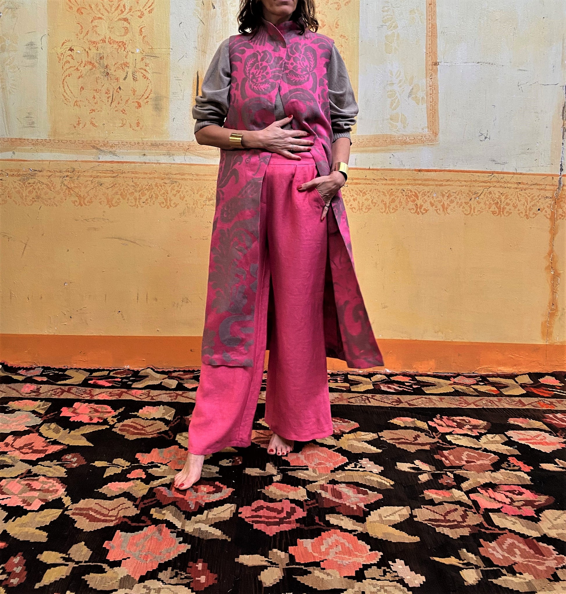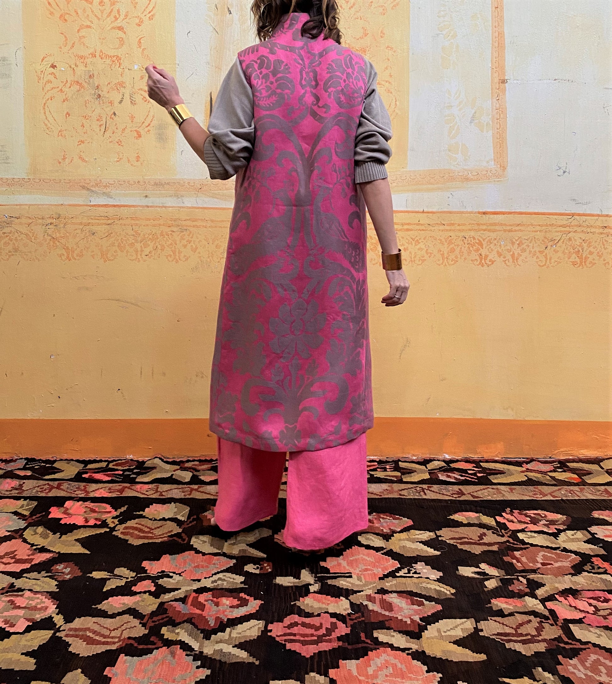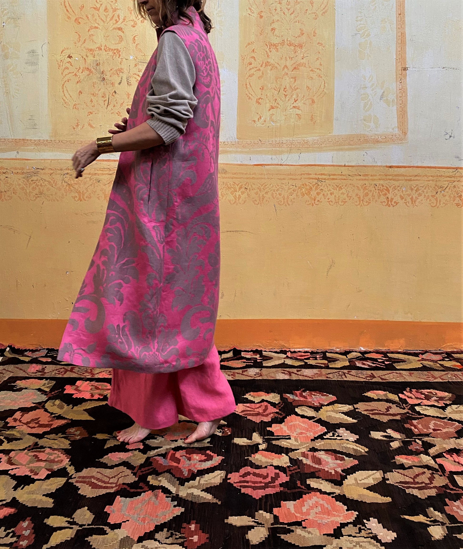 Gilet lungo in tessuto jacquard in lino con tasche e spacchi laterali
